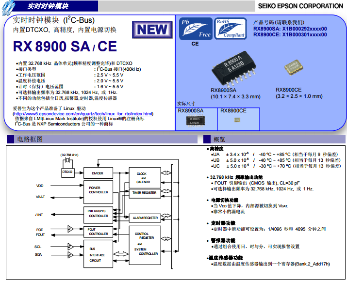 愛普生時鐘芯片模塊RX-8900共有兩種型號分別為RX-8900SA和RX-8900CE,兩種同屬8900系列肯定有較多共同點,如均內(nèi)置32.768KHz晶體單元,DTCXO數(shù)字溫補晶振,均有高精度穩(wěn)定性,內(nèi)置電源切換,應(yīng)用在安防等,消費類等。