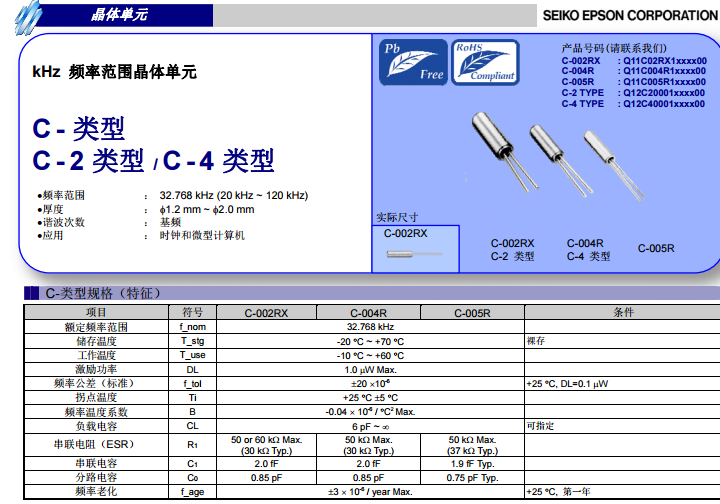 石英晶體諧振器C-002RX,屬于愛普生無源晶振,表晶32.768K,32.768K時鐘晶體具有小型,薄型,輕型的貼片晶振表面音叉型晶體諧振器,產品具有優良的耐熱性,耐環境特性,可發揮晶振優良的電氣特性,符合RoHS規定,滿足無鉛焊接的高溫,C-002RX無源晶振應用于時鐘模塊,智能手機晶振,各種小巧的便攜式消費電子數碼產品等如應用到比較高端的汽車電子產品,民用產品有家用電器,智能筆記本,MP3,MP4多功能播放器,智能手表等產品。C-002RX提供32.768kHz的基頻頻點,激勵功率最大1.0μW,不僅提升諧振時的穩定性,同時還能降低石英晶體的損耗功率,有利于實現低功耗設計。當激勵功率為0.1μW時,室溫下頻率容差僅為±20ppm,可以保證收發雙通信頻率的一致性,實現快速的頻率捕獲、同步和數據通信,為通信系統提供高精度的時鐘參考。該元件拋物線系數最大為-0.04 ppm/℃,拐點溫度25±5℃,溫度對輸出的影響進一步降低。室溫下第一年的頻率老化率為±3ppm/年,延長了元件的使用壽命。C-002RX采用特殊的圓柱形表貼封裝,外觀直徑為2.0mm,便于集成安裝在計時模塊中,大大節省了PCB的設計空間,同時可降低功率損耗,緩解集成電路中復雜的散熱問題,可廣泛應用于微型計算機、時鐘系統等大規模集成電路中,提供更加精準的計時系統。下面我們來看下C-002RX的規格書: