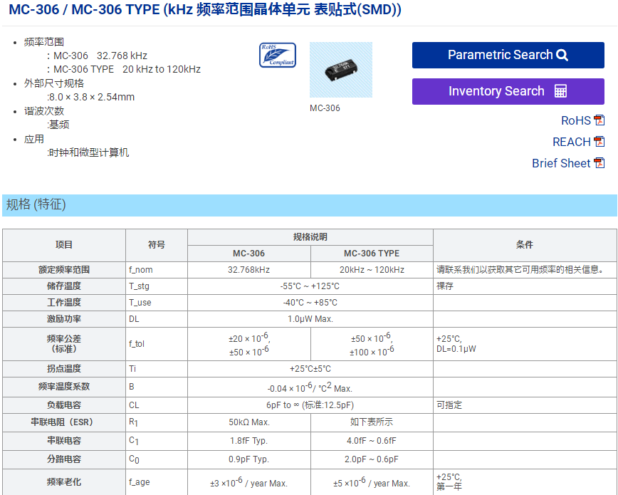今天來介紹下無源晶振MC-306,晶體諧振器MC-306,屬于愛普生無源晶振,表晶32.768K,MC-306同時也提供20kHz~120kHz范圍內的頻率定制。相較于MC-146,MC-306尺寸略大。在32768hz工作頻率下具有較小的串聯電阻(20kΩ Max.)。MC-306常用的負載電容MC-306 6pF,9pF,12.5pF等等。MC-306廣泛應用于小型便攜式通信設備,時鐘和微型計算機如手機、GPS模塊、FM調諧模塊PHS、PDA、數碼相機、、Zigbee、血糖值測量儀、信用卡結算機、各種微機的預備 時鐘、無繩電話、移動設備、電表等儀器設備等。下面南山電子給大家詳細的介紹下愛普生MC-306同系列晶振型號:
